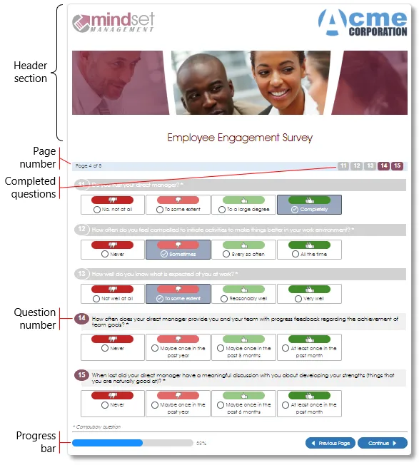 The page header section will be repeated on all pages of the online questionnaire. A header section typically includes the assessment’s name, company logos or branding, and survey-specific themes. Hint: to ensure that logos and banner images are as crisp as possible, use logo images created at a resolution that does not exceed 220 pixels wide or 65 pixels high, and banner images at a maximum resolution of 940 pixels wide and 180 pixels high.
