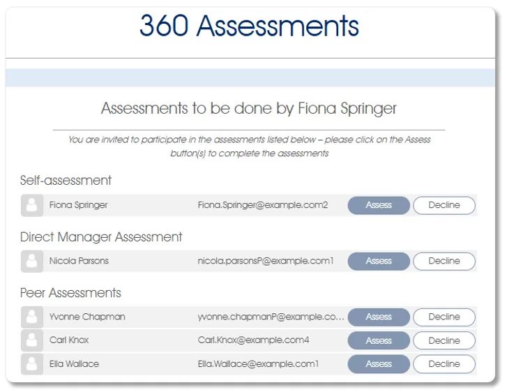 When rater Fiona Springer assesses Direct Manager Nicola Parsons, a feedback questionnaire will open. An information-sharing questionnaire will be presented when Fiona Springer clicks the Assess button for Self-assessment, and when a Peer (eg. Carl Knox) is assessed.
