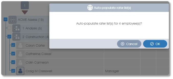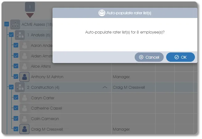 This method depends on a defined hierarchical reporting level structure in Manage PARTICIPANTS to determine line managers, peers and direct reports (see Flat lists vs Hierarchies for an explanation). Once the required employees’ checkboxes in the Assessees list have been checked, click on Auto-populate rater list(s) in the Rater lists toolbox group in the side panel. A confirmation window will open: