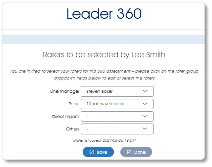 The assessee should review the presented auto-populated rater list, selecting new and/or de-selecting existing raters as required (see Editing a Rater list for detailed instructions). A Rater list saved icon will replace the Rater nomination email sent icon in the Nominate status column after the assessee has clicked the Save button.