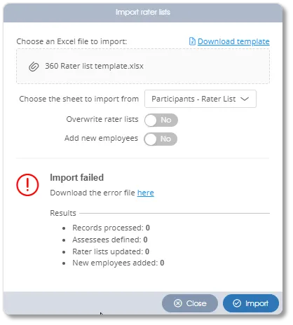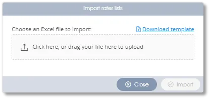 An empty Excel template file with the required column headings can be downloaded by clicking the Download template link in the Import rater lists dialogue window, accessed via the Import rater lists function in the Rater lists toolbox group: