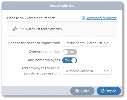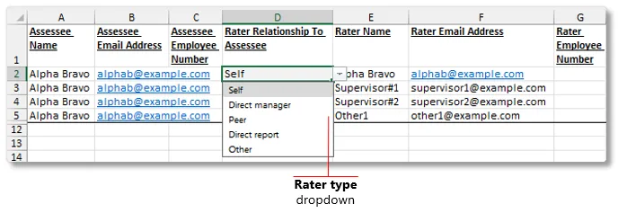 Any number of assessees and their corresponding raters are listed in a pre-prepared Excel template file: