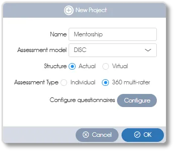 Click on the New project toolbox function in the side panel or the +New button in the work area to create a new assessment project. A dialogue window will open, and a name will be requested for the project. You will also be asked to select either an Actual or a Virtual Structure to be used as the employee list from which the assessees/participants will be drawn. In the case of the latter, select which, if there is more than one, Virtual Structure is to be used from the dropdown. (See Virtual Structures section for more on this).