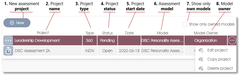 Click the New project toolbox function or the +New button (in the work area) to create a new assessment project. Click on an existing project in the list to select it (which will highlight it in burgundy), and then click on the appropriate toolbox function in the side panel or in the dropdown menu to edit or copy the project. The Delete project option will only be available if the assessment project has not yet been activated.