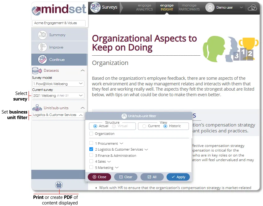 Set a business unit filter to view the recommendations of a particular sub-unit or team and click on the Print icon to print the content as displayed or to generate a PDF report. See User Interaction and Navigation for details.