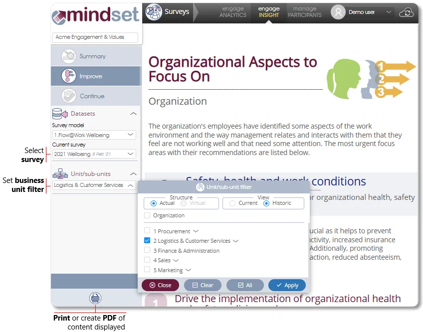 Set a business unit filter to view the recommendations of a particular sub-unit or team and click on the Print icon to print the content as displayed or to generate a PDF report. See User Interaction and Navigation for details.
