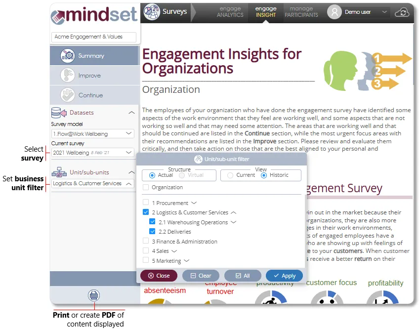 Scroll up and down to view the different parts of the report, and set a business unit filter to view the survey results of one or more business units. Click on the Print icon to print the content as displayed or to generate a PDF report. See User Interaction and Navigation for details.