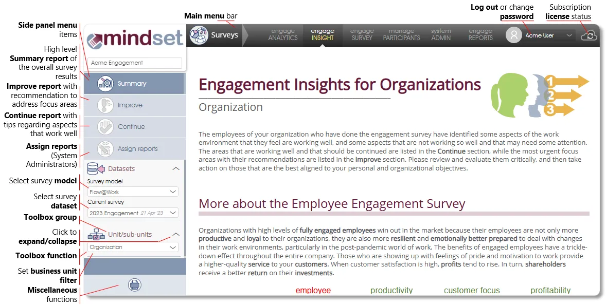 - Main menu bar – allows you to navigate between Engage EX products such as Engage INSIGHT, Engage SURVEY or Engage ANALYTICS. The name of the signed-in user and the status of the user’s subscription license will be displayed top right, in the main menu bar. A menu item for Engage PARTICIPANTS may also be shown - subject to your login access rights. This function is prominently displayed in the main menu bar as this product enables you to load and maintain the list of potential participants for future surveys and also to manage user access and administrative rights for all the various Engage EX products.
