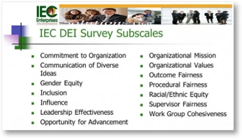 The IEC DEI Survey solicits a broad spectrum of information from employees and managers across 14 subscales (i.e. a group of questions that, together, assess an issue).